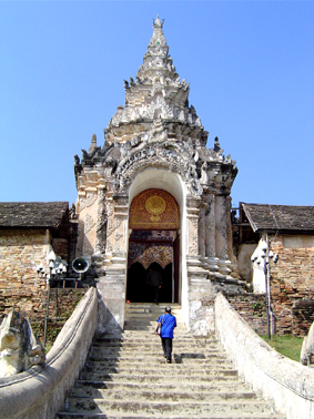 ซุ้มโขง หรือ ประตูโขง ทำหน้าที่เป็นซุ้มประตูบอกขอบเขตทางเข้าออกของวัดที่มีรูปแบบเฉพาะจากคติความเชื่อตามระบบจักรวาลของล้านนา โดยทำหน้าที่เป็นตัวกั้นระหว่างความไม่สงบภายนอกกับความสงบภายใน เป็นขอบเขตที่ทำให้ผู้ที่เข้าไปภายในวัดต้องปรับเปลี่ยนพฤติกรรมของตนให้มีความสำรวมและเหมาะสม ในเรื่องที่มาของรูปแบบซุ้มโขงนั้นมีข้อสันนิษฐานหลายประการ บ้างก็คาดว่าน่าจะมีที่มาจากรูปแบบของซุ้มพระพิมพ์แบบหริภุญชัย บ้างก็ว่ามีที่มาจากรูปแบบซุ้มประตูที่ซ้อนกันเป็นชั้นซึ่งพบสลักบนใบเสมาสมัยทวาราวดีจากเมืองฟ้าแดดสูงยาง จ.กาฬสินธุ์ แต่ที่น่าสนใจคือแนวคิดที่ว่าตำแหน่งของซุ้มโขงที่ล้อมรอบองค์เจดีย์แบบเจดีย์วัดสวนดอก เป็นลักษณะแผนผังที่เป็นที่นิยมของศิลปะพม่าที่พุกาม และแนวคิดที่อธิบายว่าเกิดจากการพัฒนาขึ้นจากเจดีย์แบบมณฑปปราสาท 5 ยอดของล้านนาเอง